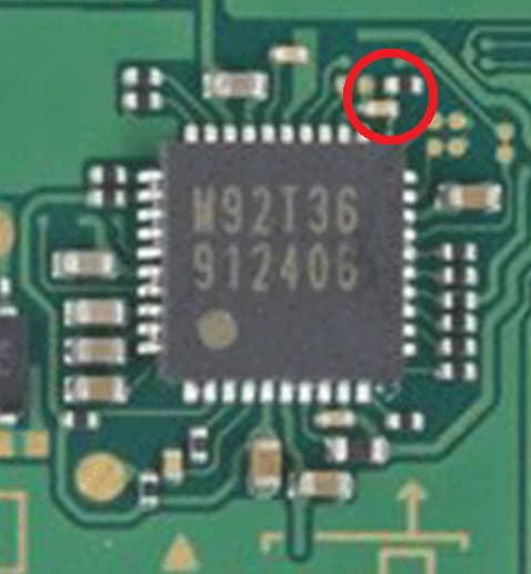 They are located towards the top right hand side of the chip with what appears to be the capacitor followed by the resistor right behind it. I would post a picture or a link, but I’m not able to do either as it seems my account is likely too new.