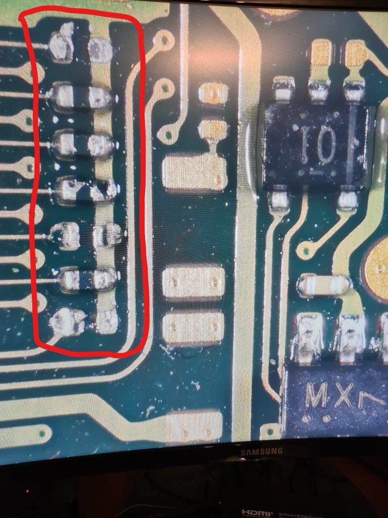 I have a Switch with no backlight. Board is HAC-CPU-10. Upon inspection I found a row of diodes pretty much the reverse side of the backlight connector. Three of them have lifted (Probably when replacing USB port). Volt drop is 1.1V Fwd bias and 0.5V Reverse bias, so I assume short? I’m using diode test on a Fluke meter but in circuit. R is 400K.