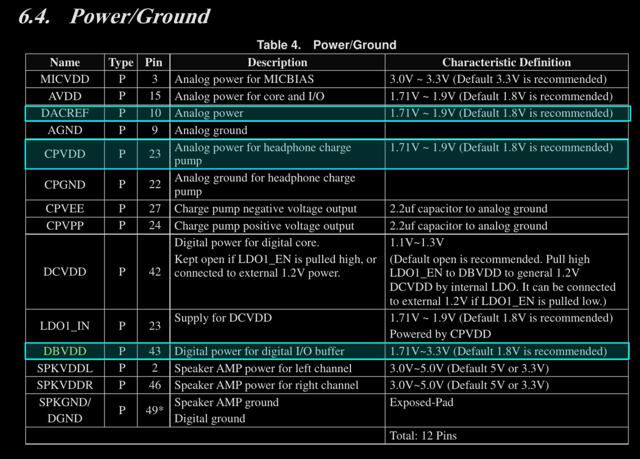 DACREF is analog power, CPVDD powers the headphone charge pump, and DBVDD is digital power, all of which expect 1.8v (ideally).