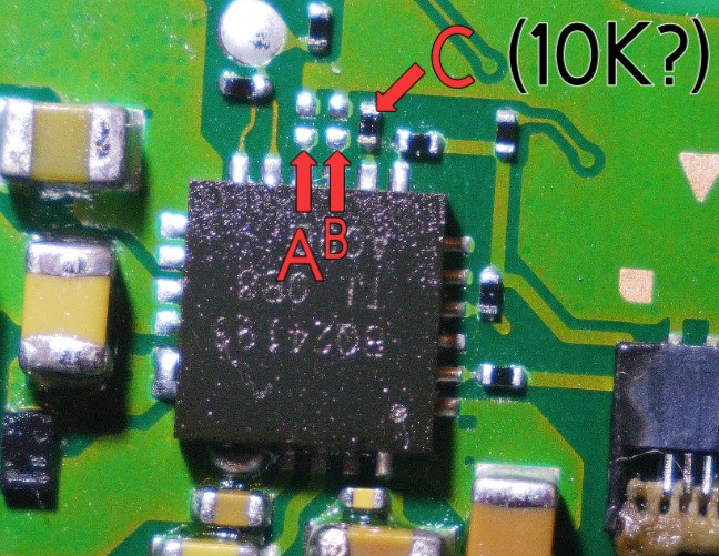 3 0201 resistors came off when extracting the BQ chip. I found 1 of them (C) and think it goes where I put it but I’m not sure. Can anyone identify these component values?