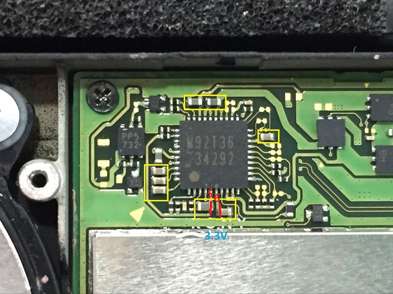 The part above the M92 (on jkyoho’s image it’s in the middle just by the top edge of the pic) is probably a resistor of 6 Ohm between ground and one of the legs of the chip. I do not fully understand that but oh well,