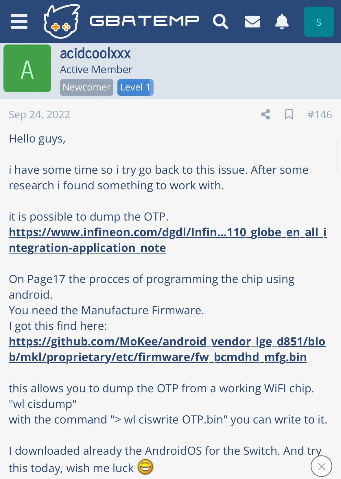 Oh I see your talking aboute FW on the Wifi/BT IC itself - Yeah it’s possible that’s the reason as several people have posted having BT issues using stock OEM IC’s … whether or not this is as a reslt of the FW on the IC I’m not really sure (or don’t remember) as I typically only use them from donors but it could well be because of that based on BT working fine for you in L4T - might be worth PMing the guy over on GBATemp and asking if he has the binary file and attempting to flash it in L4T or Android or whatnot (sorry can’t help with this as I’ve not done it myself though I wouldn’t get your hopes up as I imagine that dude would have posted if it had been successful but who knows ) and failing that just getting an IC which is from a donor or from a seller who has verified it’s from a Switch donor.