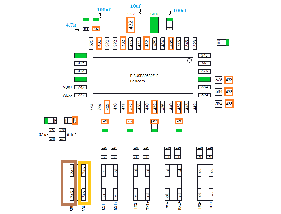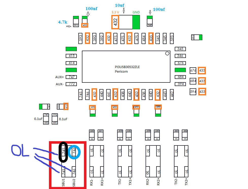 So at the first left filter you can measure aprox .746 mV on the pi3usb ic side and only OL on the usb port side. And you have OL on the same sbu line (8th pin from left) at the usb c port. That would indicate that the filter is bad. I would replace this filter.