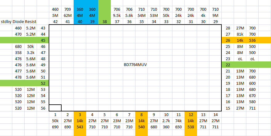 The only thing that I believe could be a real issue was pins 40/39 of BD7764 I measured having about a 2.5k path to chassis GND. F6001 and that blue 0805 package are sourcing these 12V pins. F6001 measures healthy. But I’m not sure how this would lead to a blown 5V fuse, plus another 5V fuse that shouldn’t come into contact with BD7764.