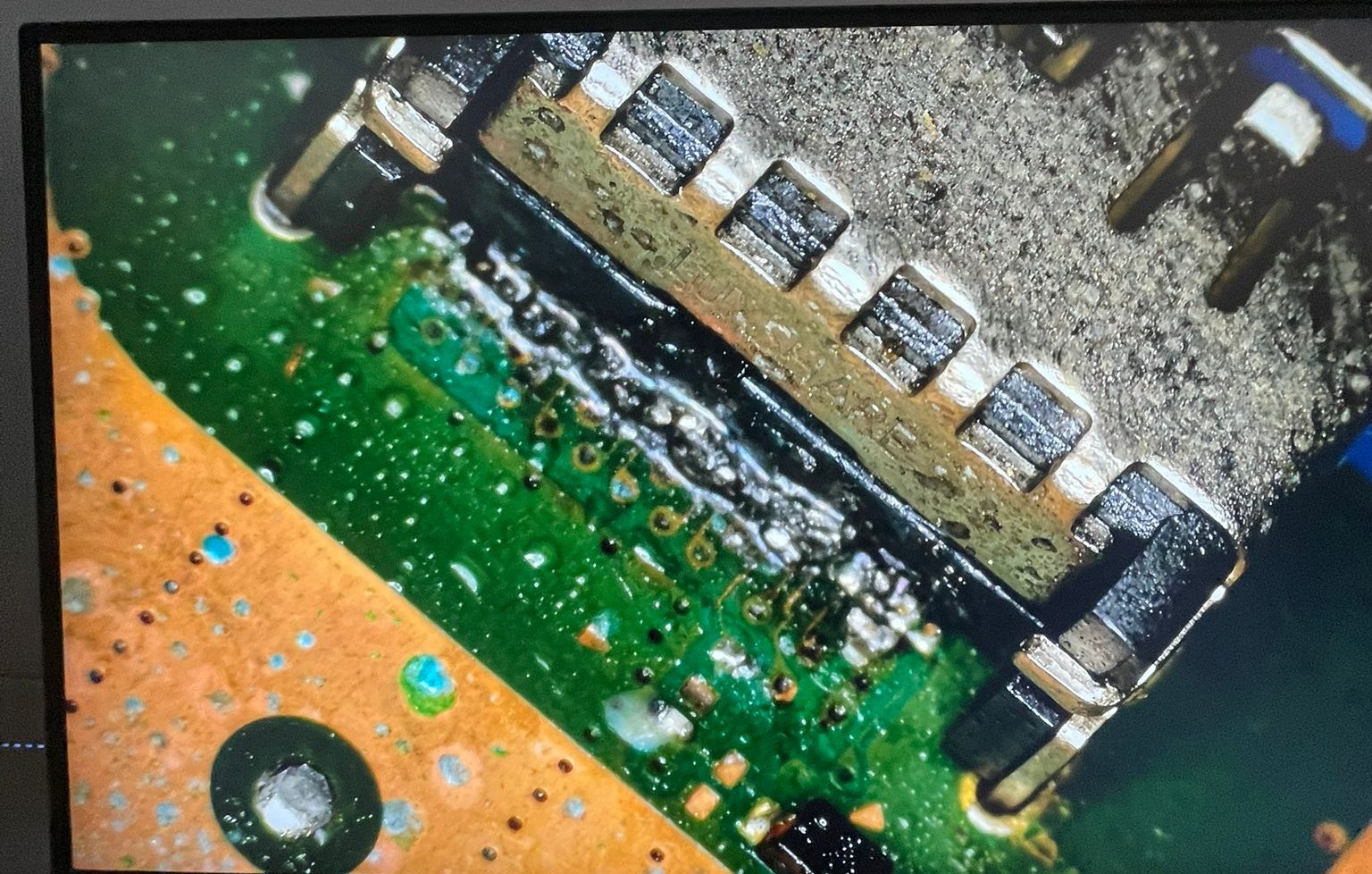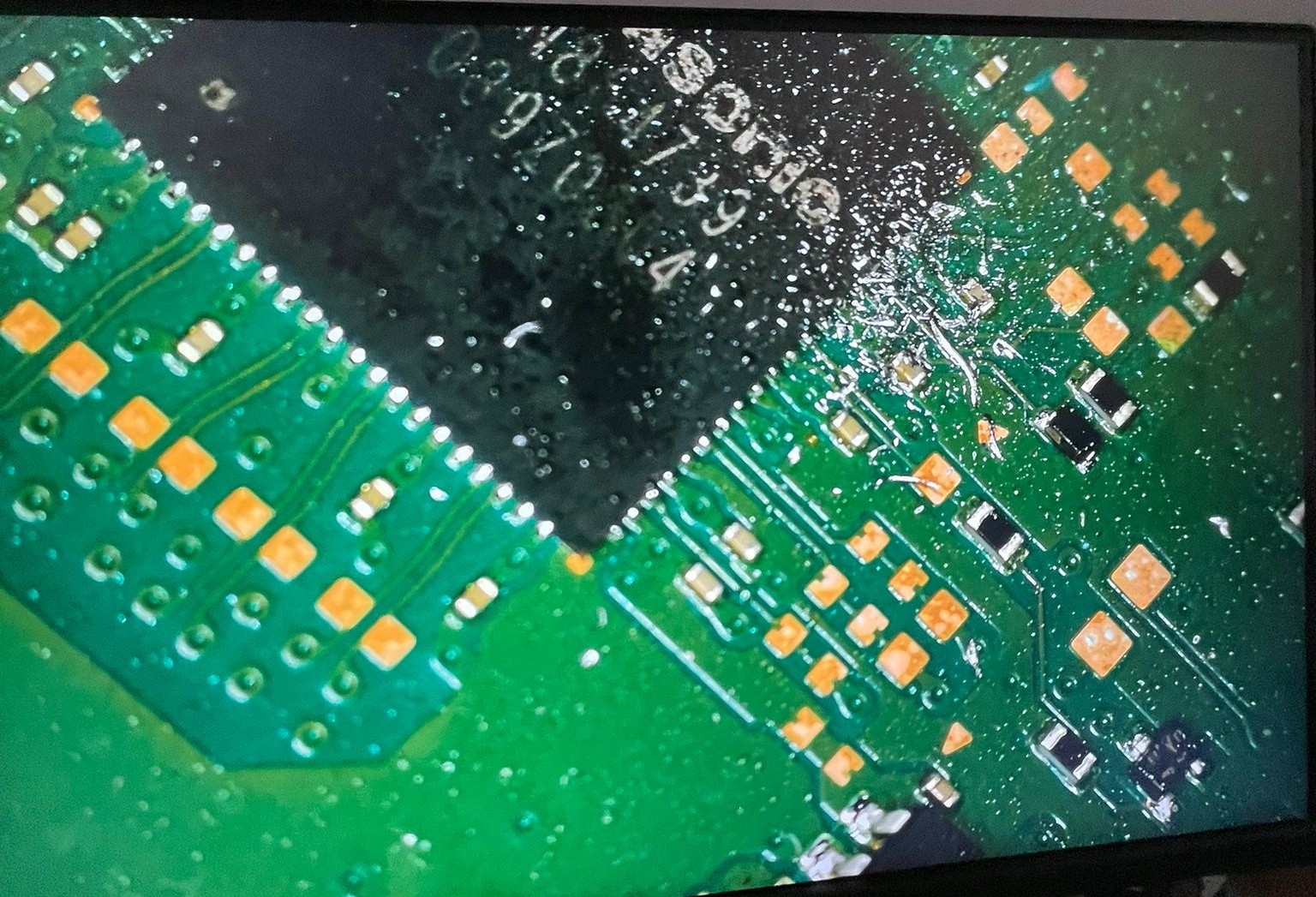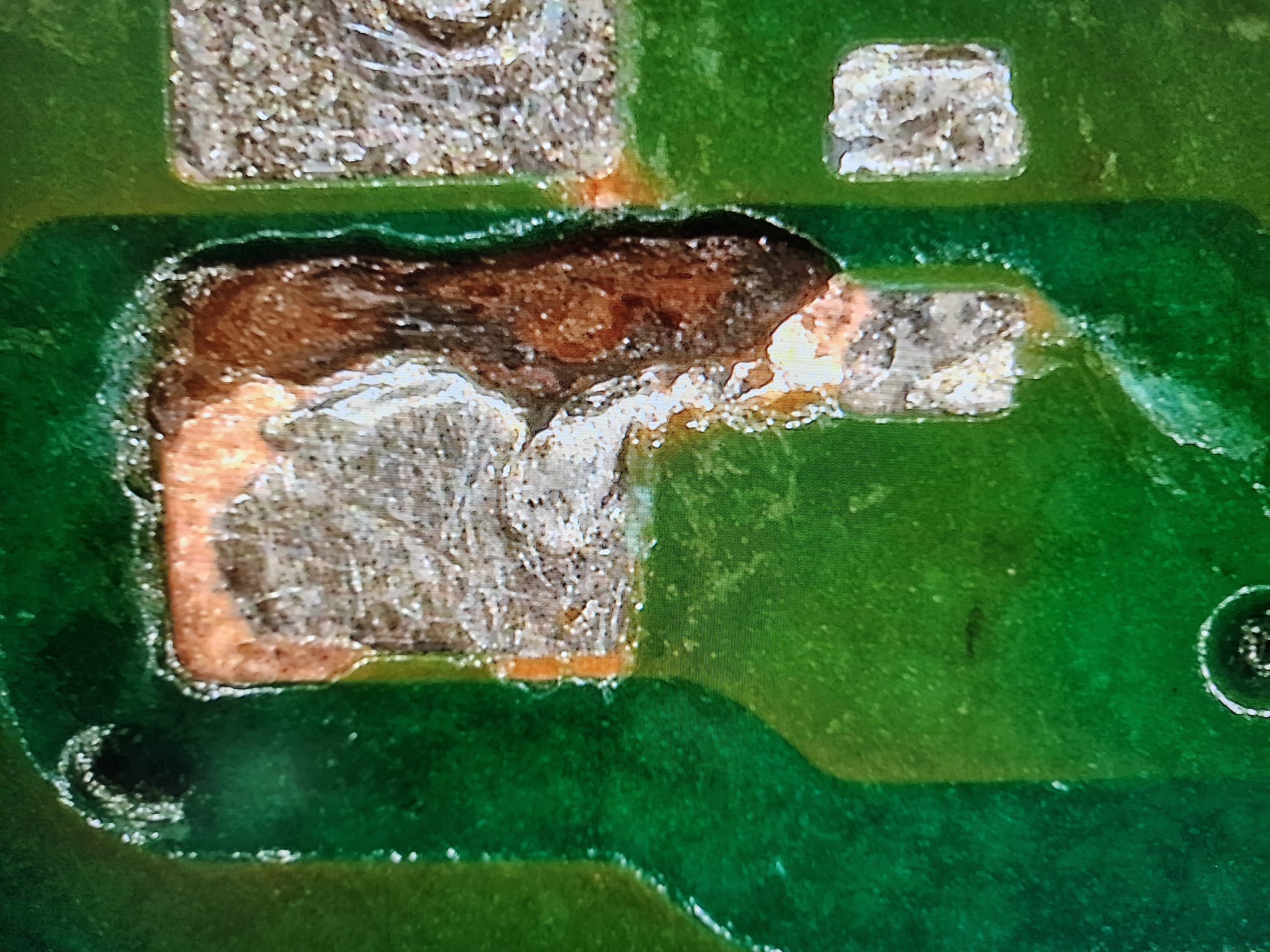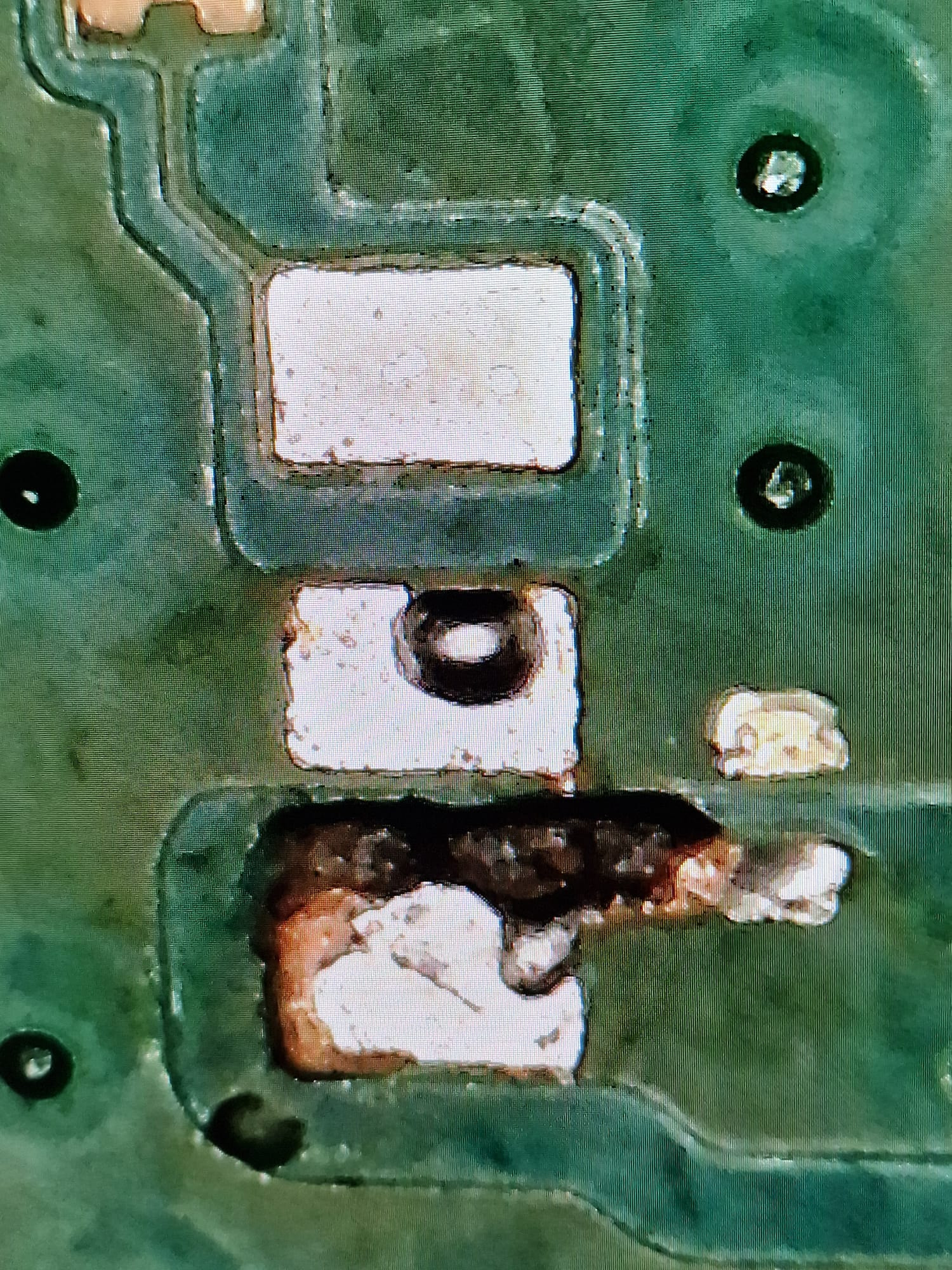 The capacitor is cracked, but there’s some weird solid stuff inside, and to make matters worse, there’s a ball of solder underneath!