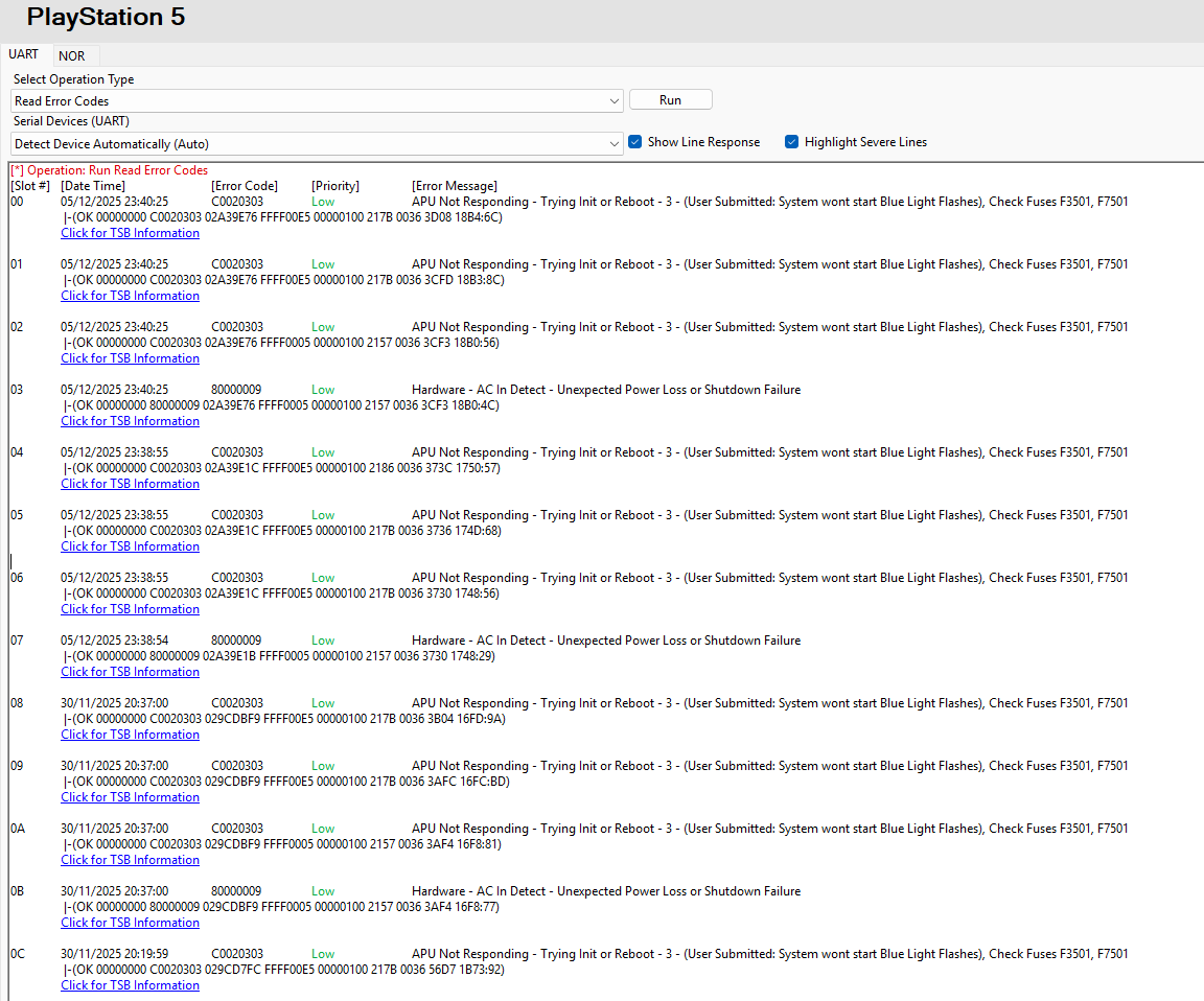 In UART mode, the console simply reports that the APU is not responding and asks to check the F3501 and F7501 fuses. I tested them and they are fine, he chip is the 7934 GL1L22.