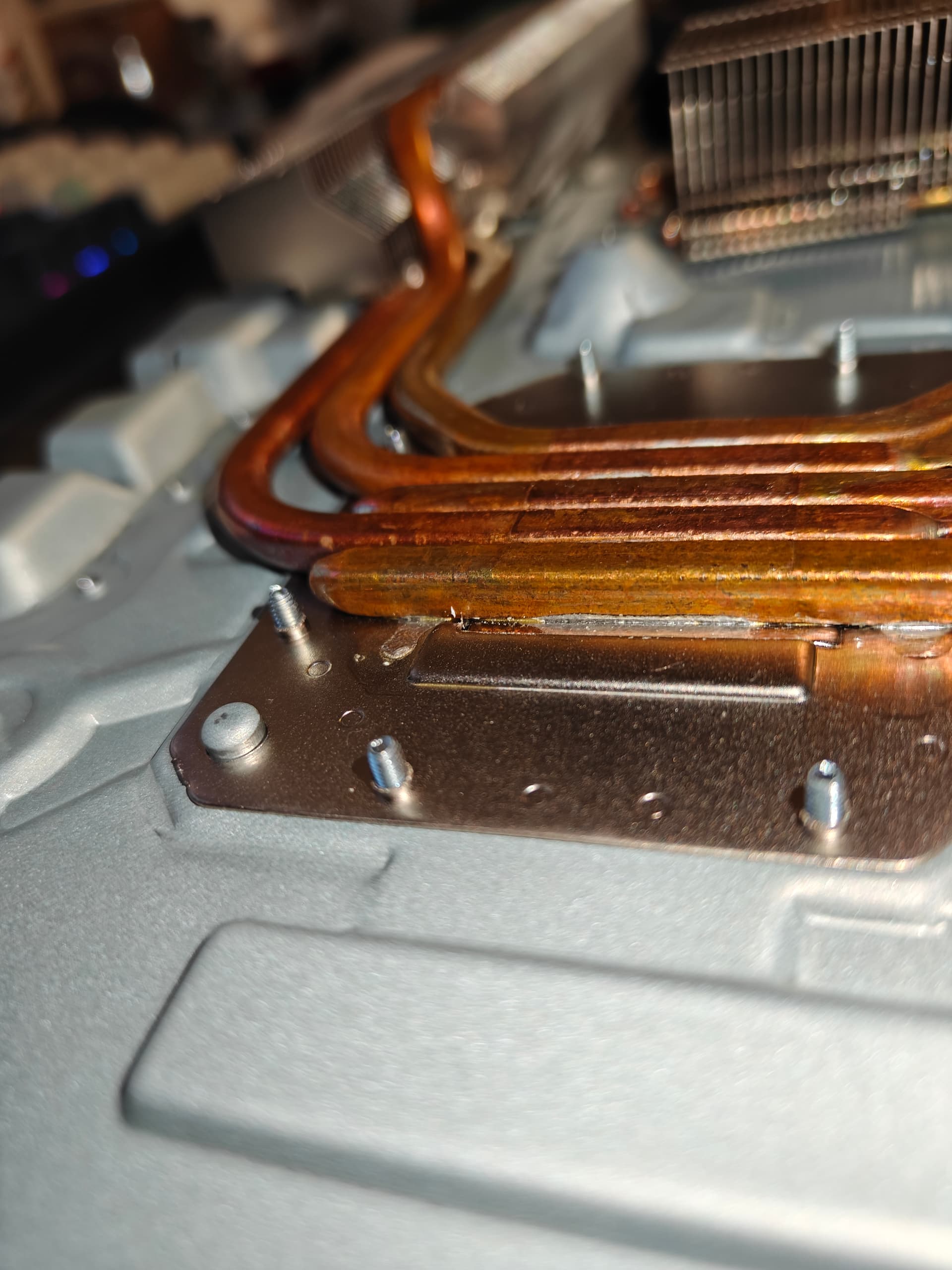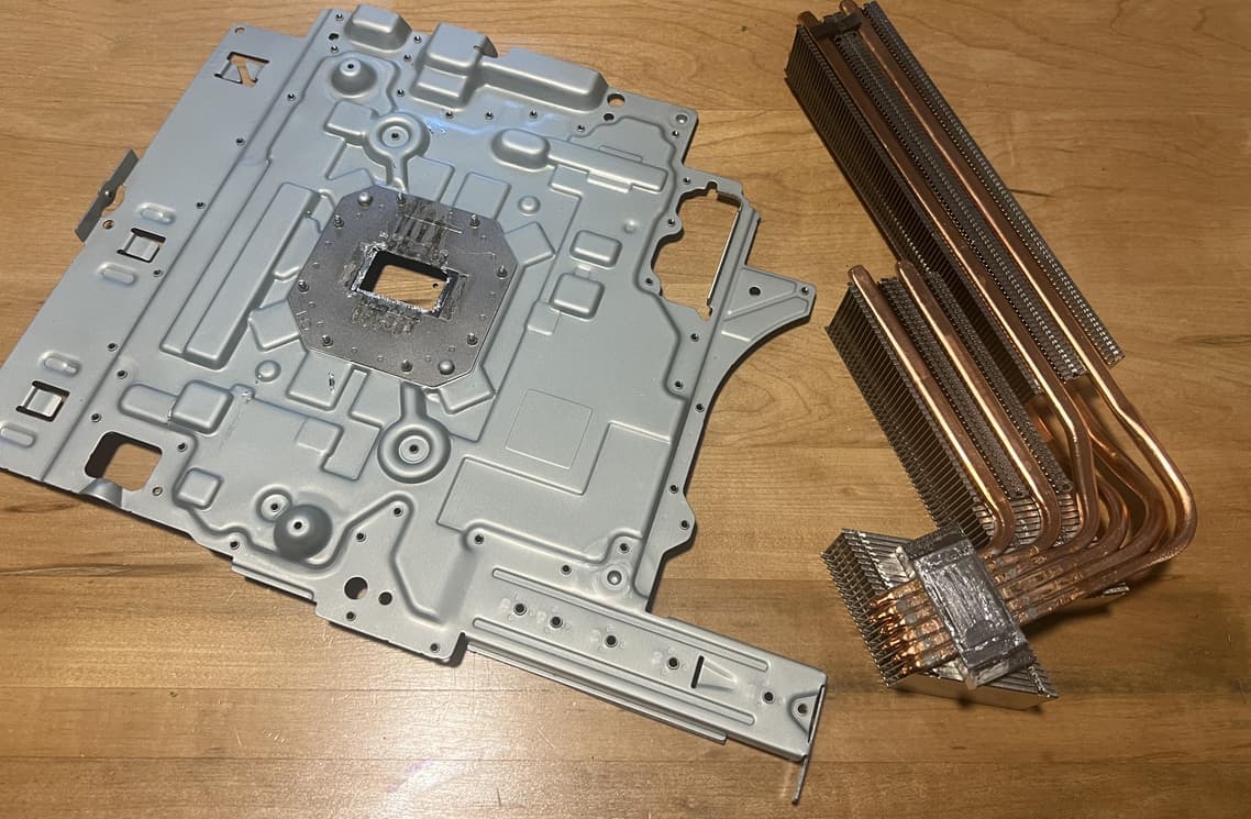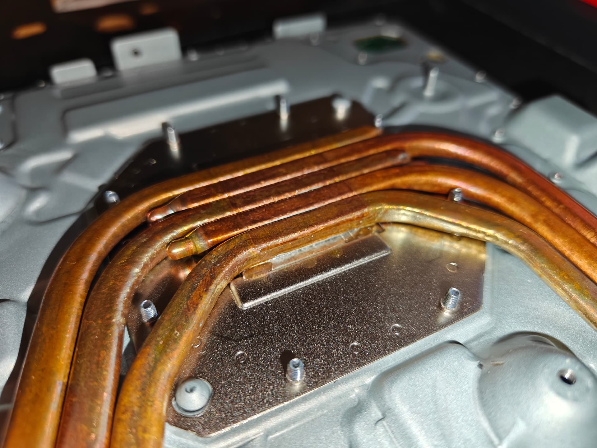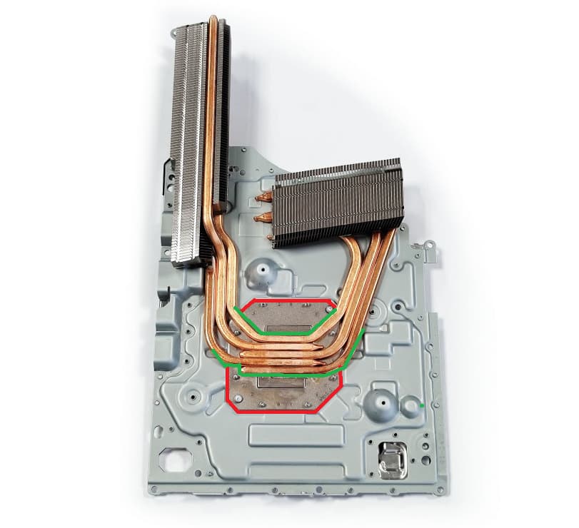 The red marked plate is screwed to the grey back plate. At the slim models the green marked heat pipes are not soldered but glued to the red marked plate. If the glue fails and the heat pipes come loose, a little plate on the backside of the heat pipes which is in direct contact with the APU, is not fixed anymore will loose contact to the APU. And so the heat transfer will not work anymore and the APU overheats