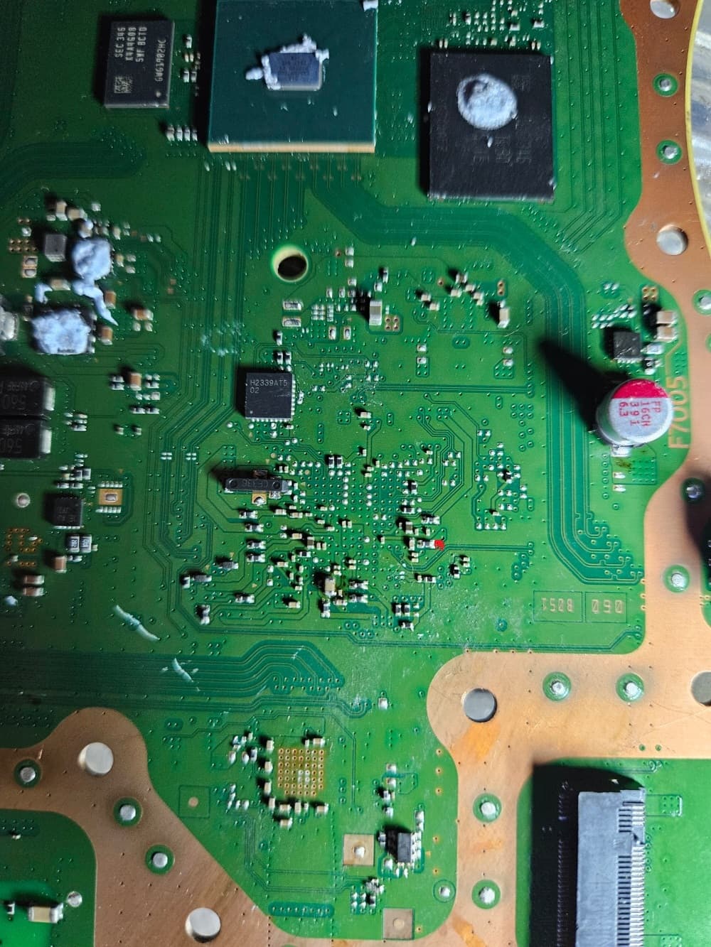 Be careful, this voltage only arrives when the console goes into standby mode and then disappears. In other words, when I plug my power supply into my card on valid, I have 3.3v on pins 1 and 22 for a few seconds, then nothing. On my card with the TPM problem, I have no voltage, ever! So I went back to find out where it came from. It is on the south bridge at the red dot, but it is also at the RT5126. However, I don’t know who activates it, that’s where I’m a bit stuck. Since the TPM contains unique information, who reads it and how? If I don’t find any physical problems (damaged track, missing voltage, broken component… or other) then it will have to resolve to say that the TPM is broken