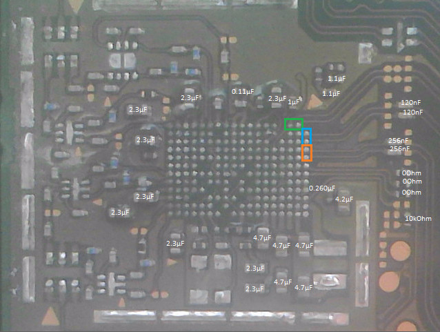 Bottom of caps has normal reading in diode mode. Too of caps , one is 0 and the other reading 2.9 in diode. I trace to the top next to the outside pad near wifi chip but it seems goes to wifi or the back of chip