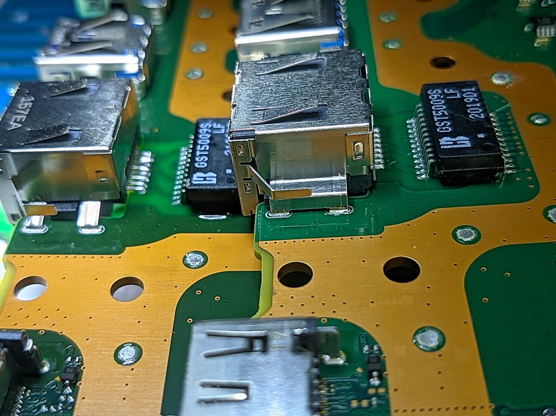 This ps5 came in for lan port repair and turned out some genius already put ps4 lan port on and 5/8 pads ripped off due to the inner dimension difference from two generation PlayStation,which leads to ps4 lan port shorter and smaller than pS5’s lan port. The lack of sitting on the edge makes smd lead pins easily lift up and tear off the pads.